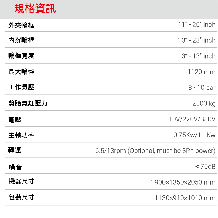 • 配置AL390H輔助手臂,可以操作壓胎塊對準壓胎,三點式壓胎提高設備拆裝效率